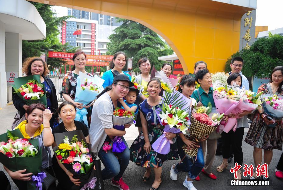 6月8日,山东济南众多妈妈手捧鲜花,等候即将结束高考的学子。中新社记者 张勇 摄