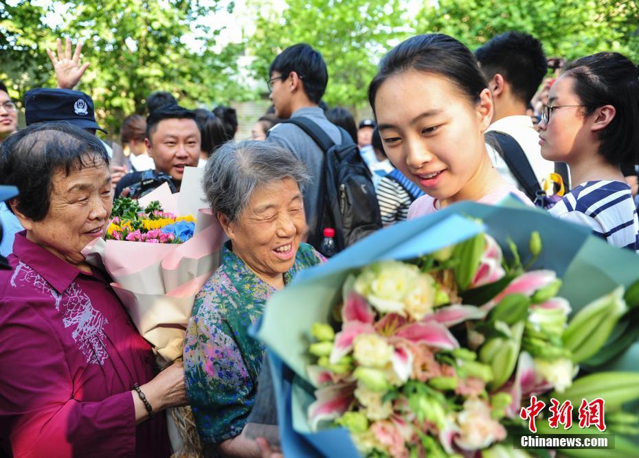 6月8日,奶奶、姥娘捧花争迎结束高考学子。当日,中国大部分地区高考结束,山东济南众多考生手捧鲜花在家长的簇拥下欢快告别高考。中新社记者张勇 摄