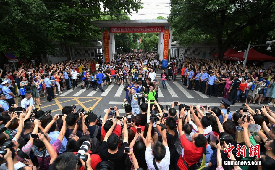 6月8日下午,2017普通高校全国招生统考结束,率先跑出长沙市一中考点的几位考生抬着同学冲出考场。中新社记者 杨华峰摄