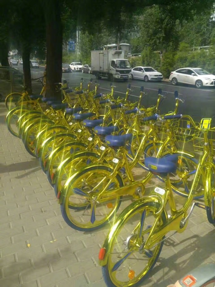 6月8日,有网友在网上晒出图片:“谁说颜色用完了?小金车上路了,刺瞎你的眼… ????”图片中共享单车“小金车”惊现街头,金光闪闪十分扎眼。