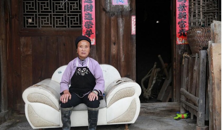 明朝遗风和民族风情,都敌不过现代化的脚步。村民虽然还住着石头房、木屋。但室内陈设已经慢慢现代化。传统和现代,就这样在村庄混搭着。图为村民坐在家门口的沙发上。背后的木屋上还贴着春联和门神。