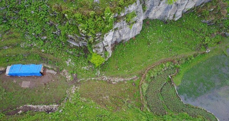 航拍图显示,洞穴堡垒在一个山谷之中,距离村庄有两里多路。洞穴堡垒藏在一个名叫“天神坡”的山峰山腹中。