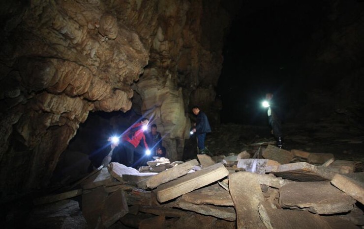 构成洞体的岩石,都是页岩。页岩自然风化后,形成一片片如混凝土砖一般的石片。村长说,以前村里很多房子,都是用这种石头来盖的。直到现在,还经常有村民到洞里来搬砖盖房。