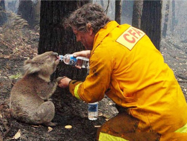 大叔给考拉喂水