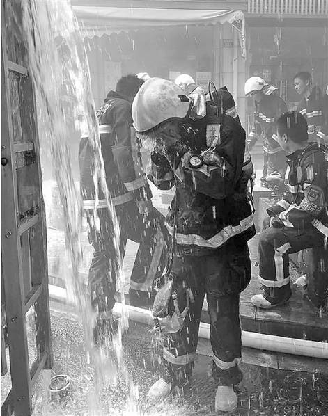 参与救援的消防员介绍,当时下去救援时,不确定旁边的情况,除了第一时间控制自燃车辆,还用水枪对准了相邻的车子,避免火苗蔓延过来。“除了自燃车辆,其他车辆都没有受损。”事后有记者得知,消防员秦强前一天生病去了医院,医生说他得了急性肠胃炎。但接到任务时,秦强什么也没说就和同事一起赶到现场。为了迅速给自己降温,秦强还用消防水带不断地从头顶浇水下来,但恶心还是没有得到缓解。图为消防员秦强从火场出来浇水降温。