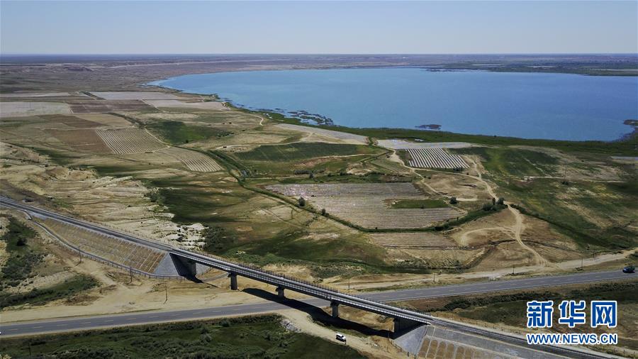 这是在新疆阿勒泰市阿苇滩镇拍摄的北(屯)阿(勒泰)铁路与216国道线的交汇处(6月10日摄)。