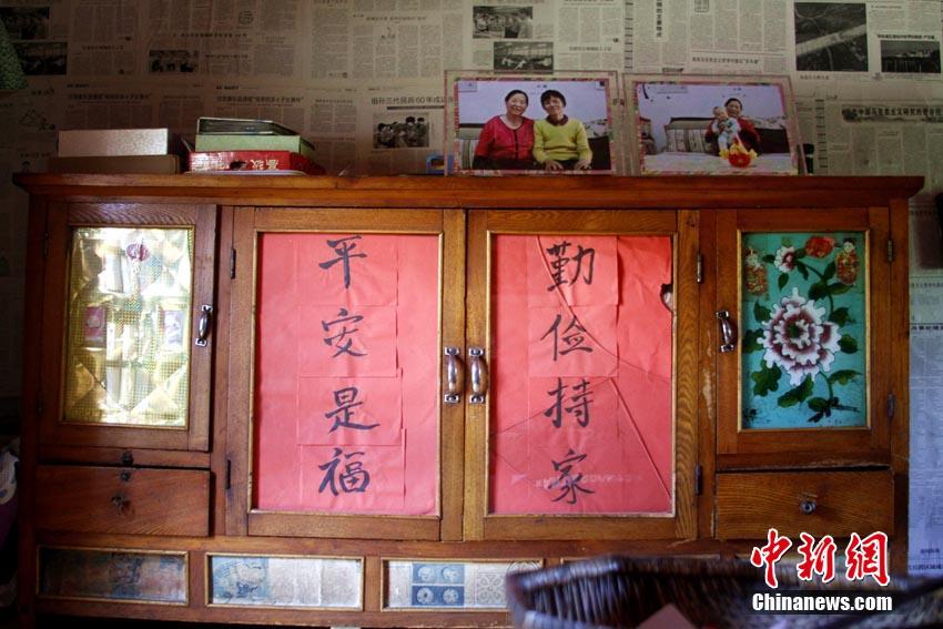 左奶奶家炕上的柜子上贴着“勤俭持家、平安是福”的红对联,她说,这是她们家的家训。 赵超 摄