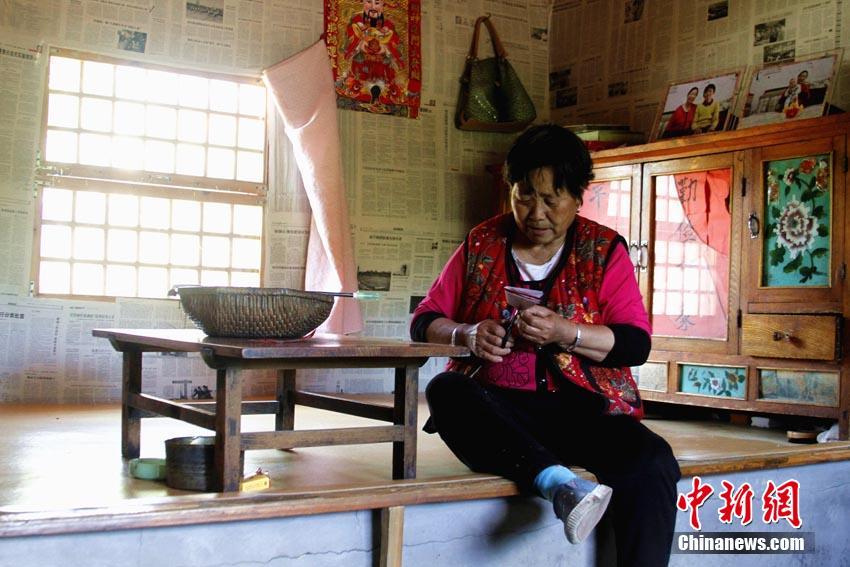 左奶奶祖籍山东曲阜,1976年嫁到这里,已经在木屋村生活了40年的时间,现在只有大儿子陪在身边,小儿子一家都住在威海。村子开发旅游之后,左奶奶也开始“上班”了,农闲时节坐在家里剪纸,每天能赚80块钱的“工资”。赵超 摄