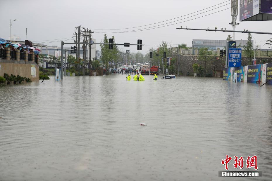 6月12日,贵阳市孟关汽车贸易城附近道路积水严重。当日,贵阳市气象台于6时28分将暴雨黄色预警信号升级为暴雨红色预警信号,持续降雨造成贵阳市多处路段严重积水。中新社记者 贺俊怡 摄