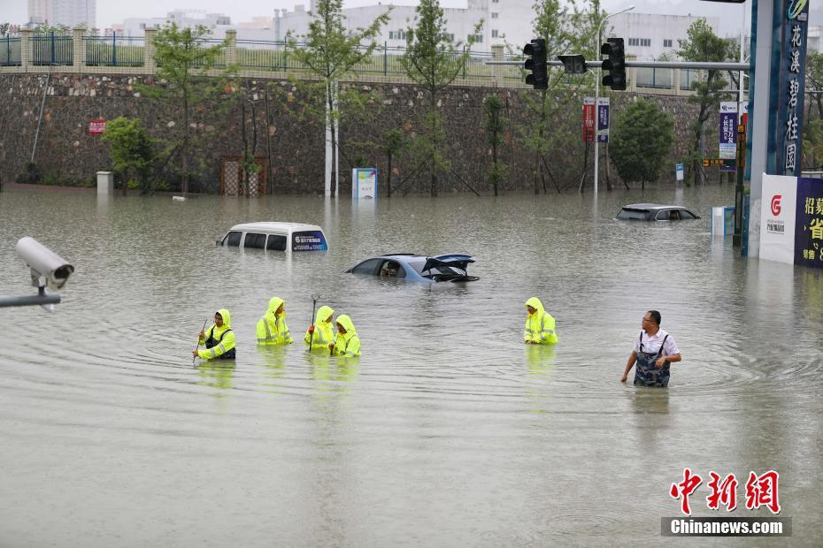 6月12日,贵阳市孟关汽车贸易城附近道路积水严重,环卫工人在检查被淹车辆。当日,贵阳市气象台于6时28分将暴雨黄色预警信号升级为暴雨红色预警信号,持续降雨造成贵阳市多处路段严重积水。中新社记者 贺俊怡 摄