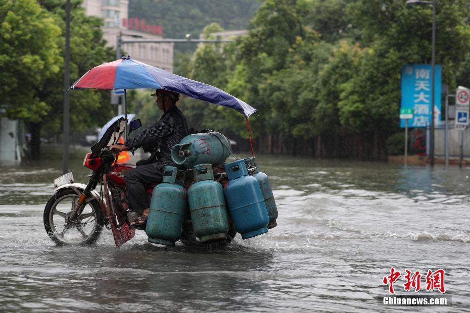 6月12日,贵阳市民骑摩托车在积水路段行驶。当日,贵阳市气象台于6时28分将暴雨黄色预警信号升级为暴雨红色预警信号,持续降雨造成贵阳市多处路段严重积水。中新社记者贺俊怡 摄