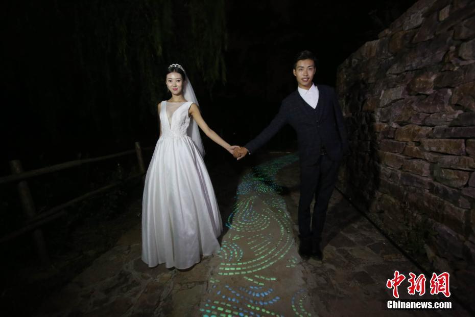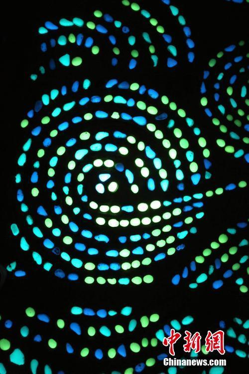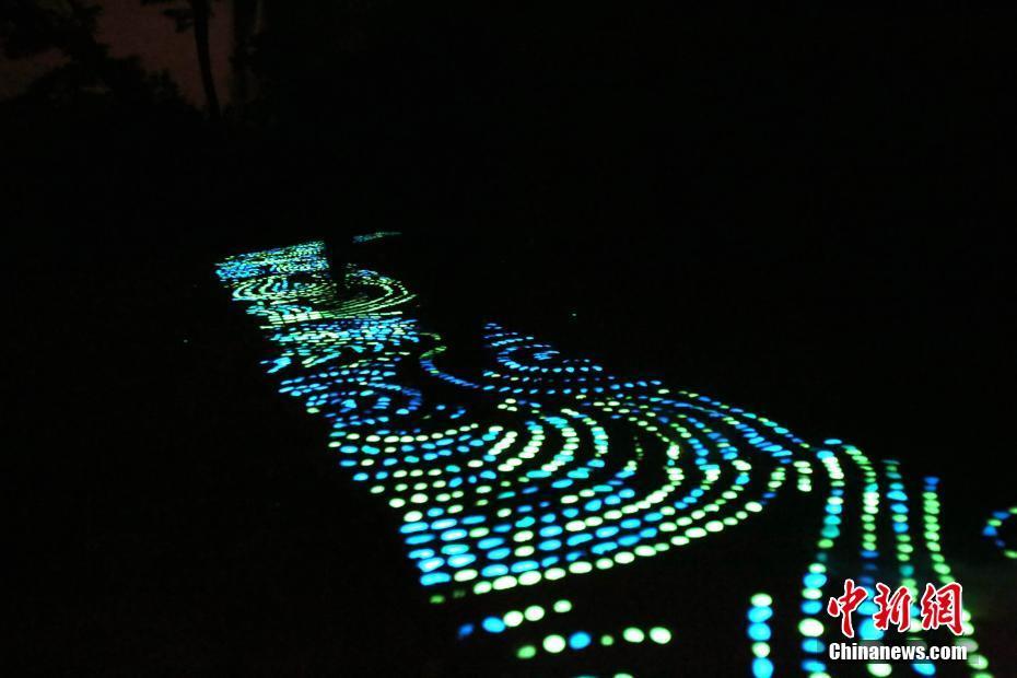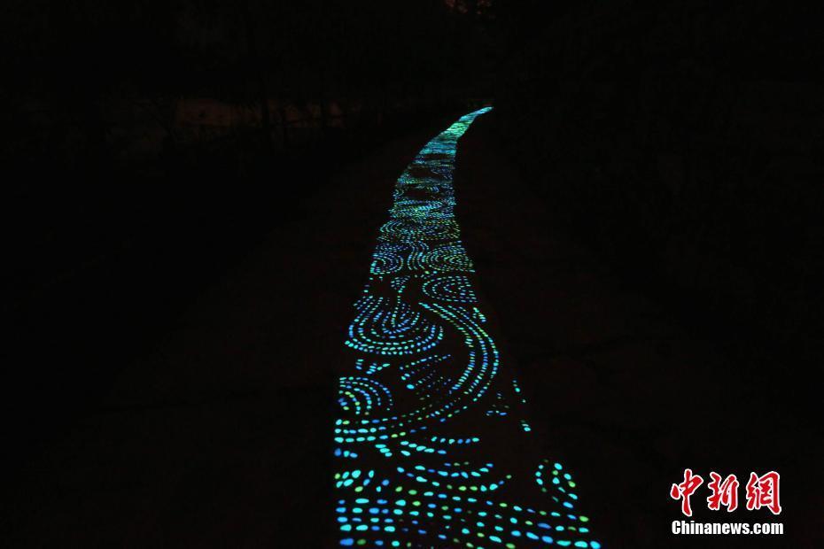 6月12日晚,在河南郑州新密伏羲山景区内的伏羲湖,中原首条荧光步道正式亮相。该荧光步道灵感设计来自于梵高的《星空》,一到夜晚,荧光步道色彩斑斓,犹如行走在银河。据景区相关负责人介绍,这条环湖荧光步道长度有800多米,是用近百万颗蓝、绿、黄等不同颜色莹光石头铺设而成。王中举摄