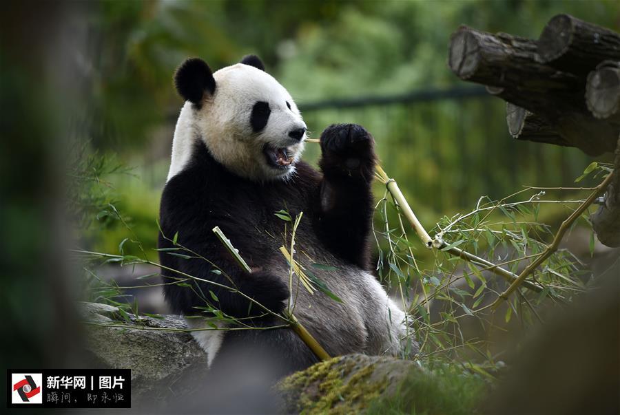 2017年4月14日,在法国圣艾尼昂博瓦尔动物园里,大熊猫“欢欢”在吃竹子。博瓦尔动物园是世界十大动物园之一,拥有大约一万只动物。新华社/法新