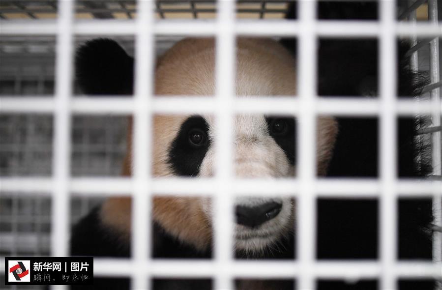 这是2017年6月5日在成都双流国际机场拍摄的大熊猫“阳浜”。 6月5日晚,三只旅日大熊猫“海浜”“阳浜”“优浜”平安抵达成都双流国际机场。经过检验检疫部门消毒放行、海关现场查验并办理通关手续后,三只熊猫于6日凌晨返回成都大熊猫繁育研究基地。在一个月的检疫期后,它们将与公众见面。新华社记者薛玉斌摄