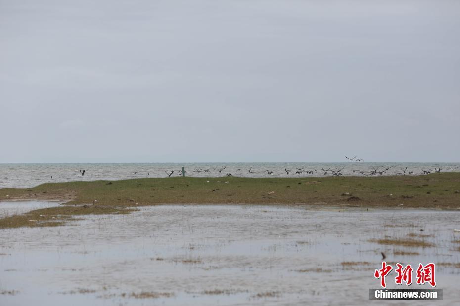 沙柳河入湖口大量水鸟等待捕食洄游而上的湟鱼。