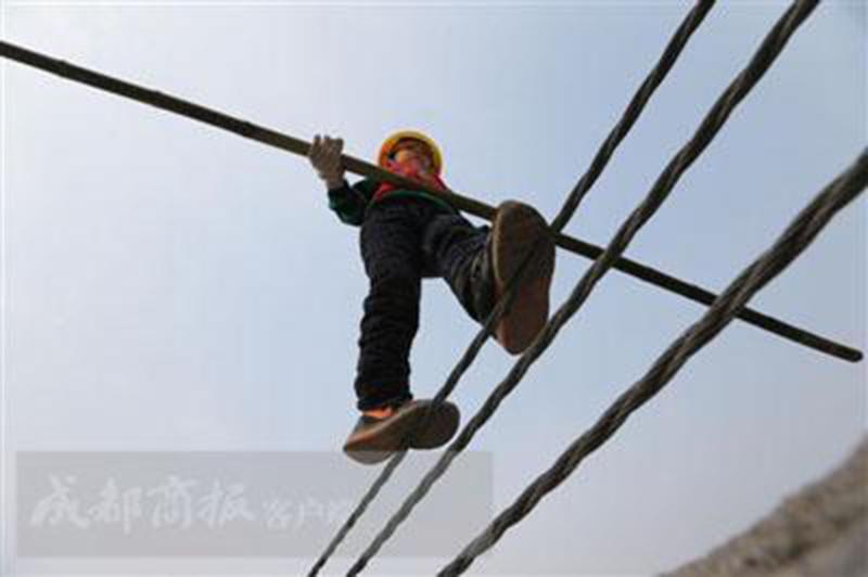 事实上,这已不是望望第一次成为网红。今年1月,成都商报就报道了望望在张禹的训练下走钢丝的故事。去年下半年,张禹在地里拉了一根绳子,望望偶然上去走了两步,平衡性保持得不错,张禹认为孩子有这方面的天赋,便把地里的绳子换成钢丝绳,然后每天陪孩子训练。图为望望在5米多高的河堤护栏上走钢丝。