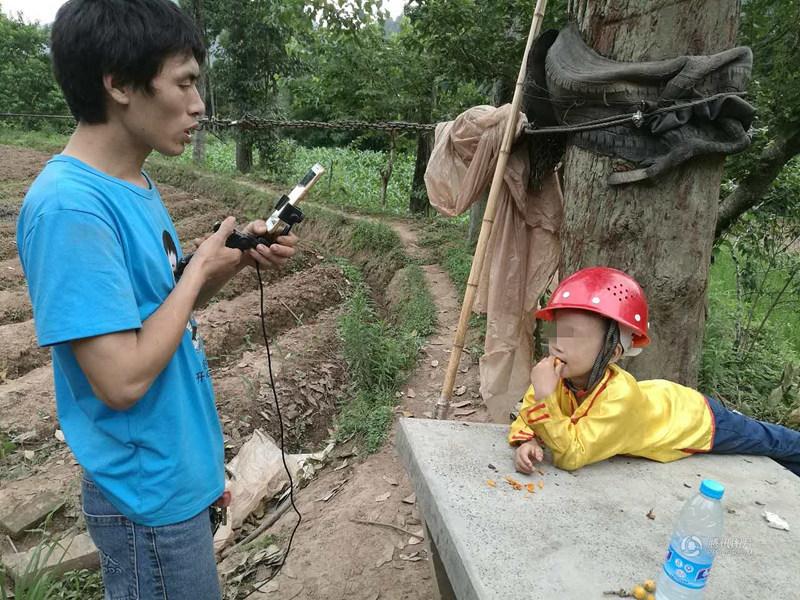 望望走钢丝的事情经报道后,一家电视台邀请张禹带孩子去做节目。张禹说,那一路他很自豪,他跟望望说:“儿子,是你带着爸爸一起飞的哟。”张禹告诉记者,当时觉得很不容易,一个农村孩子能上电视,被那么多人关注,这是儿子的本事。后来由于望望表现过于紧张,“从没见过那么多人围上来的阵势,又不会说普通话”,张禹称,录制最终取消。图为望望在玩耍。