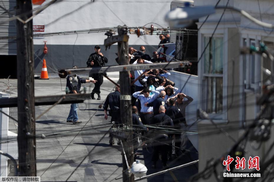 当地时间6月14日上午九时许,美国联合包裹服务公司(UPS)位于旧金山的一处物流中心发生枪击案。四人中枪身亡,包括枪手本人在内。图为几名快递公司员工站在公司楼顶,并把手举过头顶。