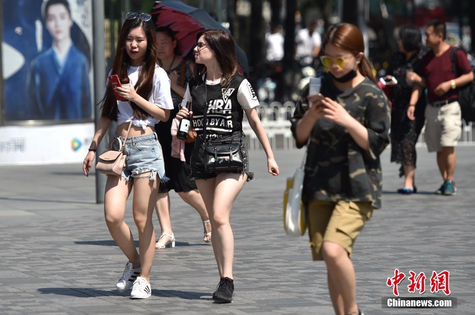自入夏后,北京气温节节走高,官方曾多次发布高温预警。6月14日开始,北京再度开启炎夏节奏。6月15日06时中央气象台继续发布高温黄色预警,当日最高气温可达38℃左右。图为北京三里屯街头美女清凉出行。中新网记者 金硕 摄