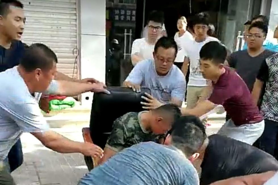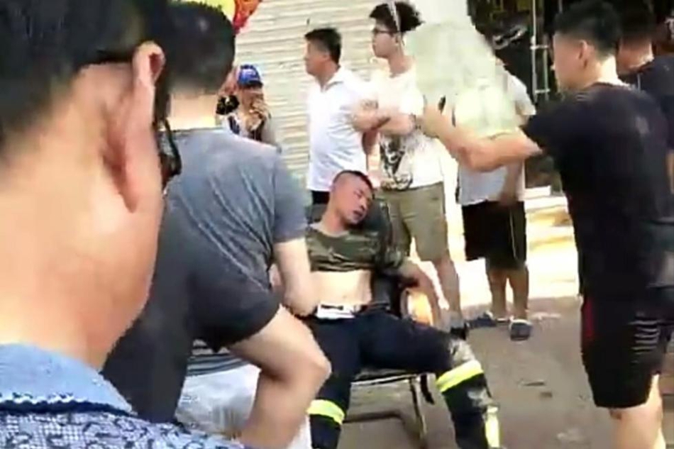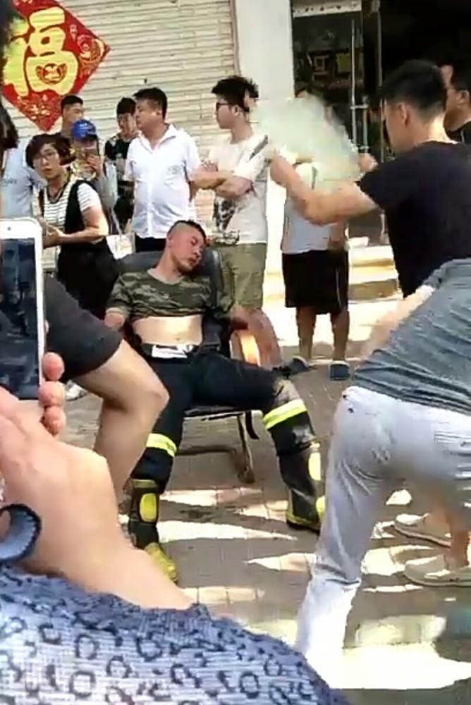 这名消防员醒过来之后,仍准备继续救火,被市民拦住。热心市民为他脱下鞋子,扇扇子降温解暑,友爱的一幕被围观市民记录下来。
