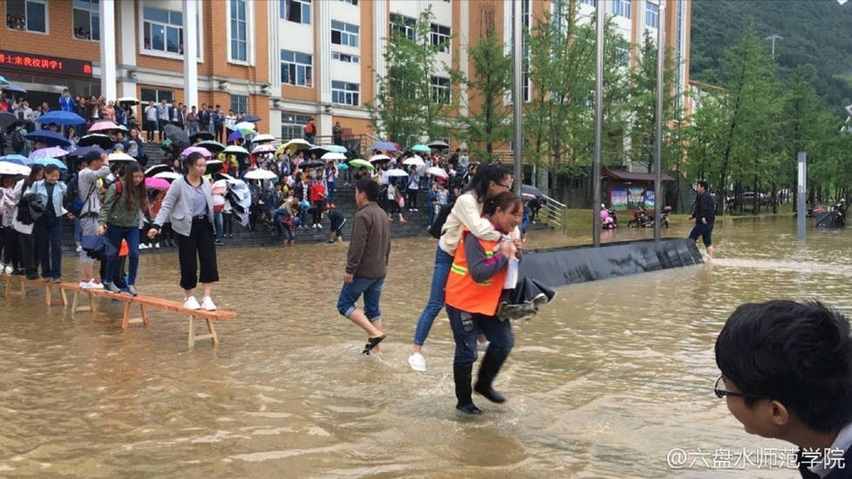 6月14日21时37分,贵州六盘水市气象台发布暴雨蓝色预警,该市水城县、钟山区、盘县中北部部分乡镇降水量达到暴雨量级。六盘水师范学院低洼地带形成积水。15日早上,学校安排校内保洁阿姨用长凳搭起了“水中桥”,并在水中扶着学生们过“河”,更有甚者,很多学生被保洁阿姨背着淌水,此举引发网上大量热议。