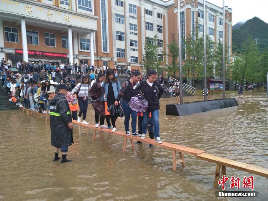 学校组织环卫利用椅子在积水中临时搭“桥”,方便师生通行。