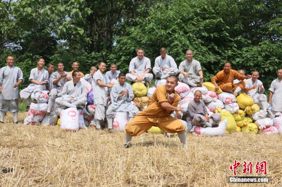 在收麦歇息期间,少林寺的武僧们还兴致勃勃地展示少林拳法,引得一阵阵喝彩声。 岳龙 摄