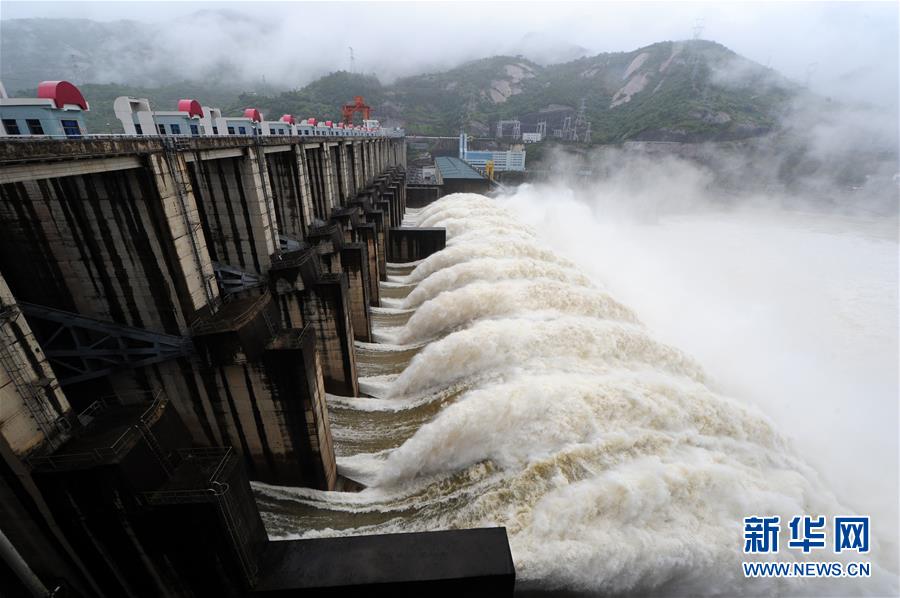 6月17日,位于福州闽清境内的水口水电站开闸泄洪。连日来,受强对流和台风天气影响,福建省闽江流域出现连续大面积强降雨。为缓解闽江上游闽西北三明、南平等地防汛压力,水口水电站已将溢洪闸门全部开启。新华社发(郑祖植摄)
