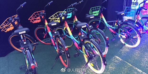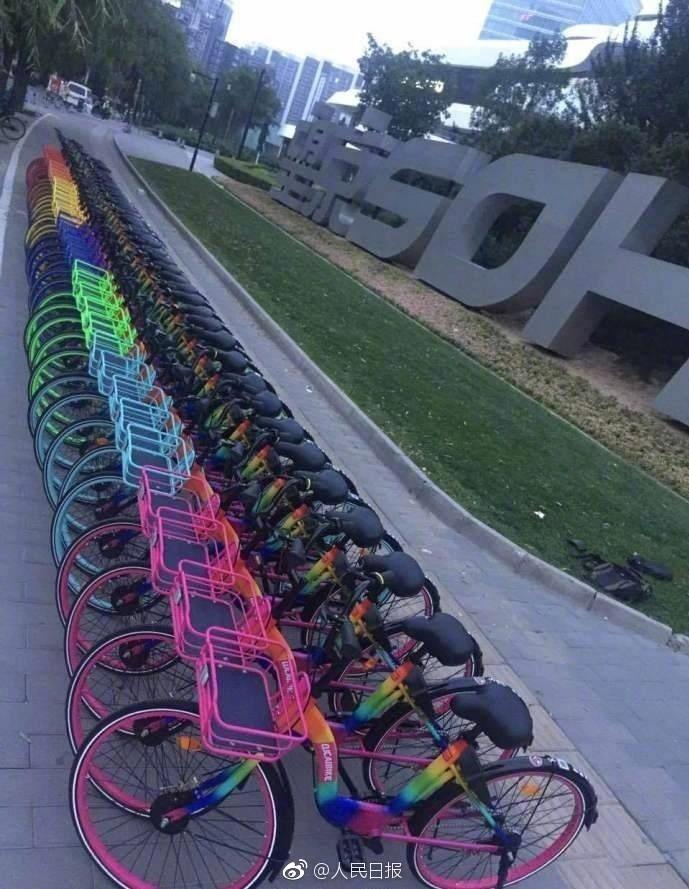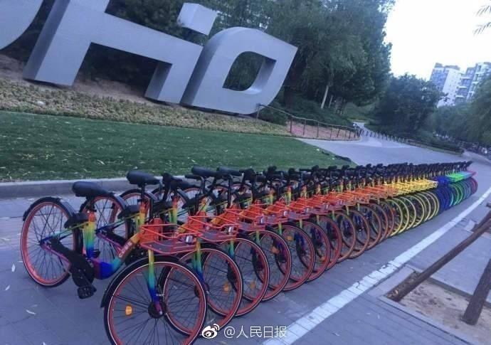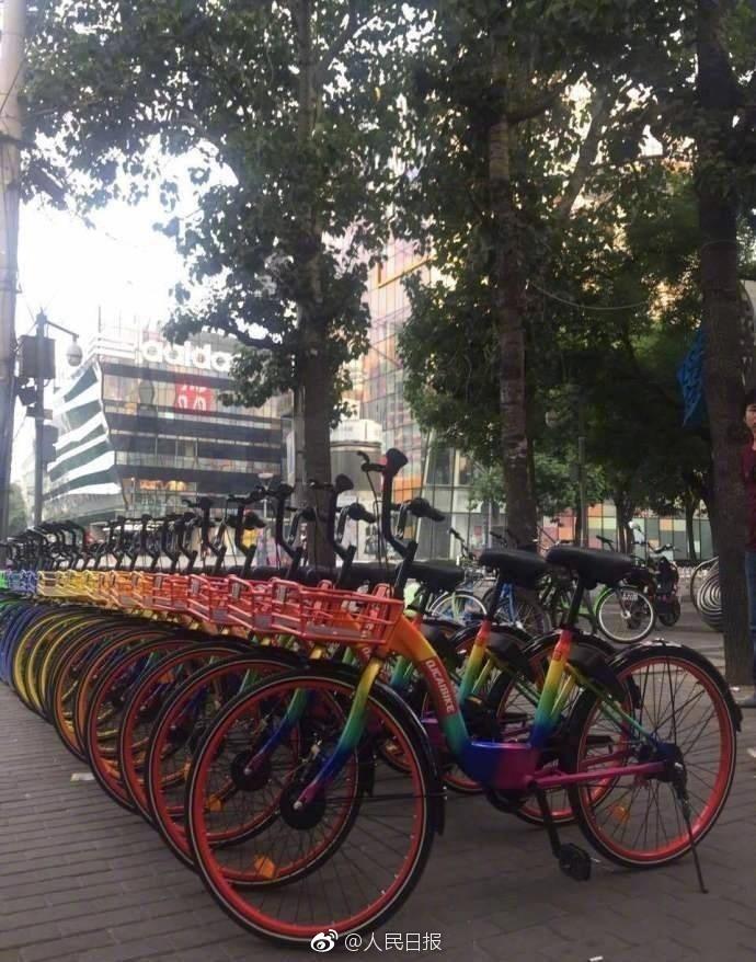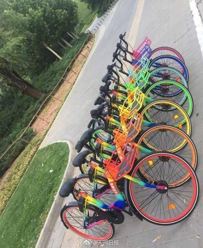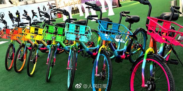 有媒体称,该“七彩单车”集红橙黄绿青蓝紫颜色于一身,目前国内共享单车品牌层出不穷,网友调侃颜色都快用完了。