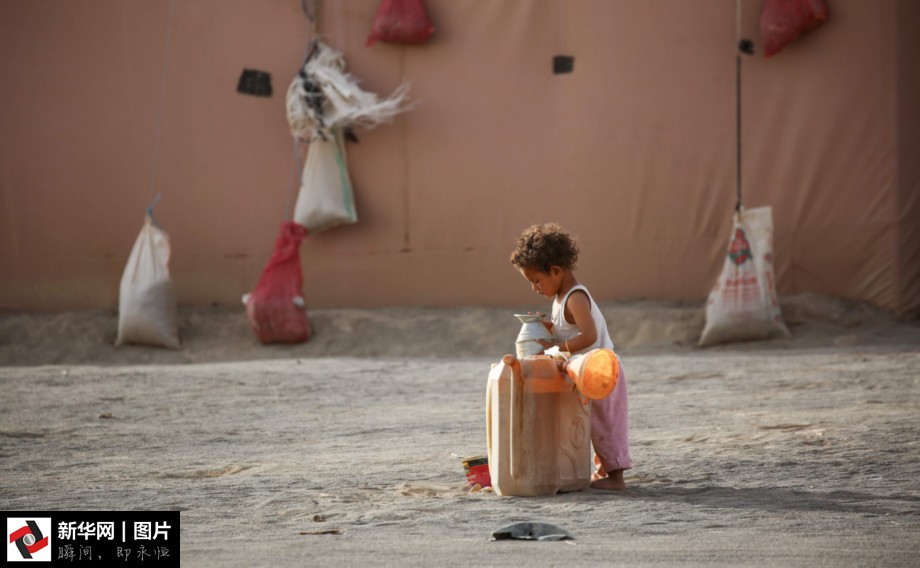 2017年5月10日,在叙利亚拉卡附近的卡拉马村,一名逃离拉卡战火的叙利亚难民儿童站在汽油罐旁。DELIL SOULEIMAN/法新