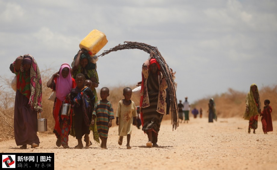 2017年3月26日,在索马里拜多阿,人们为了躲避旱灾携带行李走向一处临时难民营。FEISAL OMAR/路透