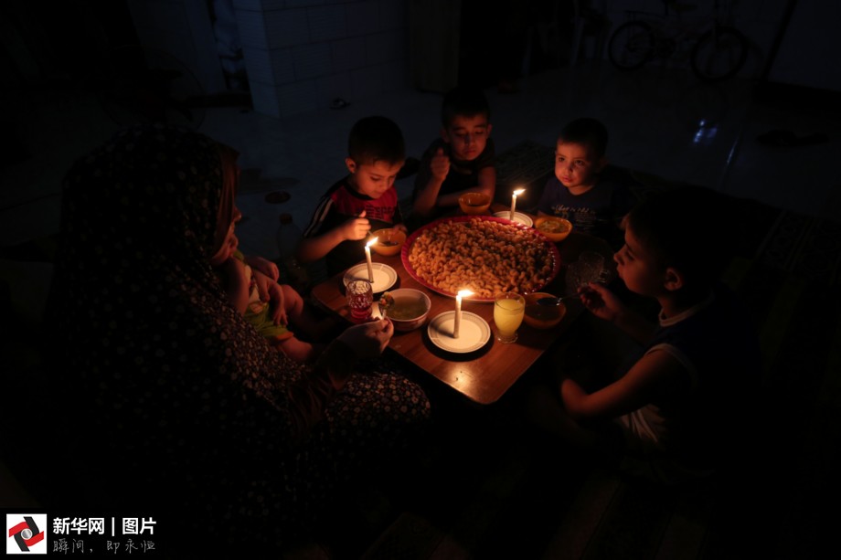 2017年6月11日,在加沙地带南部拉法难民营,一家人在停电的家中用餐。
