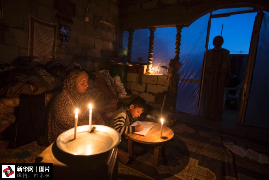 2017年4月19日,在加沙地带南部的汗尤尼斯难民营,一名巴勒斯坦妇女在烛光下辅导孩子学习。MAHMUD HAMS/法新