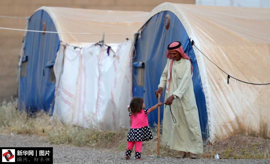 2017年6月6日,一名男子和一个小女孩站在伊拉克埃尔比勒附近的哈济尔难民营里。