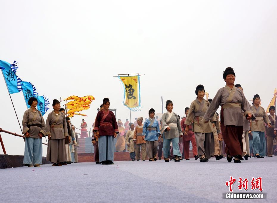 身着古装的当地渔民登上祭台,向湖神鞠躬祭拜。王昊阳 摄