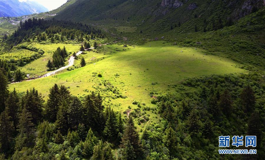 这是甘肃省甘南藏族自治州迭部县扎尕那高山草原与原始森林风光(6月20日摄)。