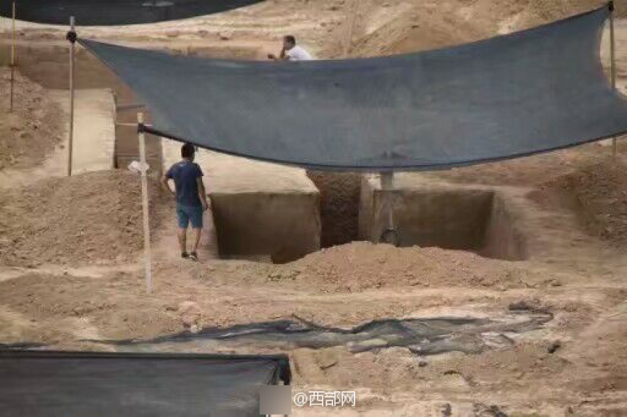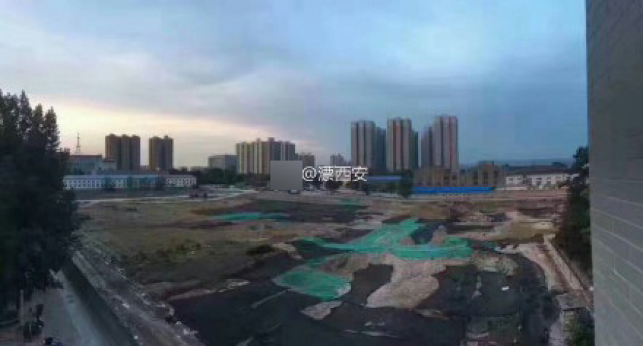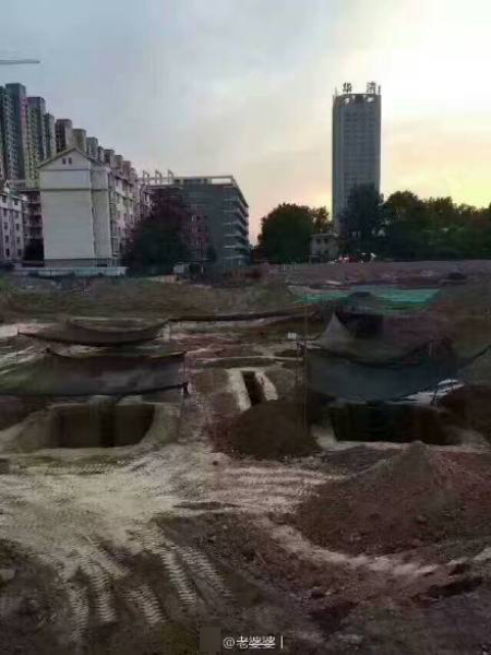 2017年6月22日报道,西安建筑科技大学华清学院校园内一建筑工地现古墓。来源:西部网