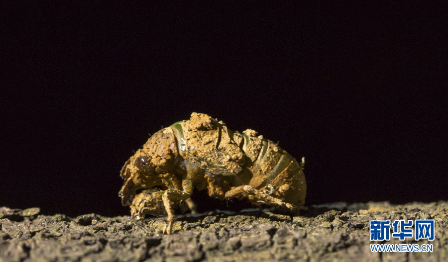 蝉幼虫从壳的头背部上方裂开了一道口慢慢爬出。新华网发(黄巧珠摄)