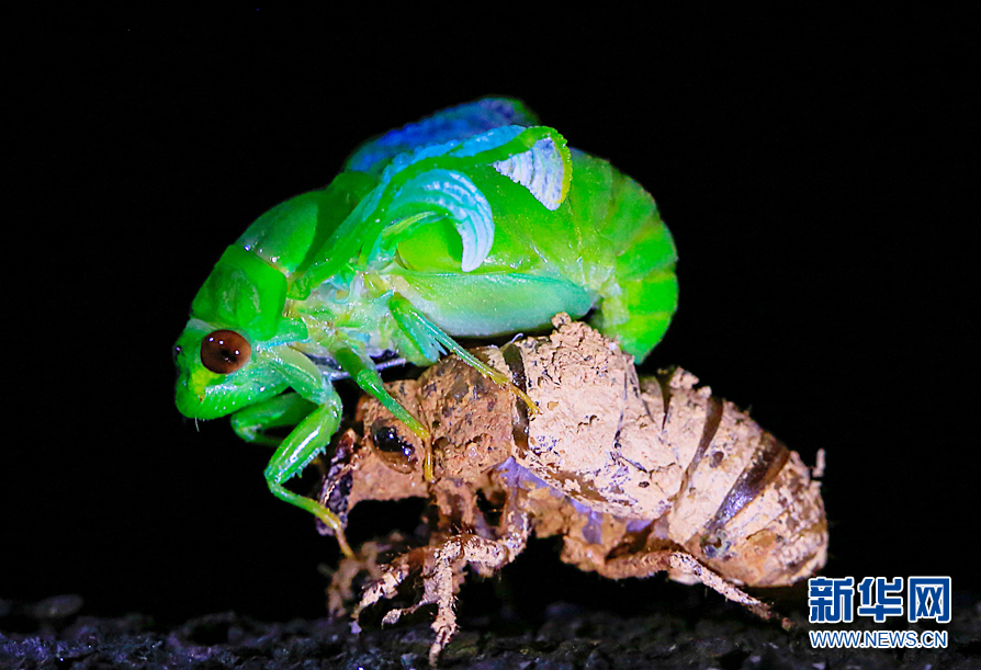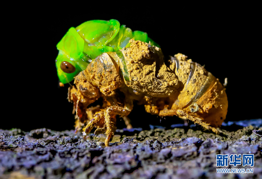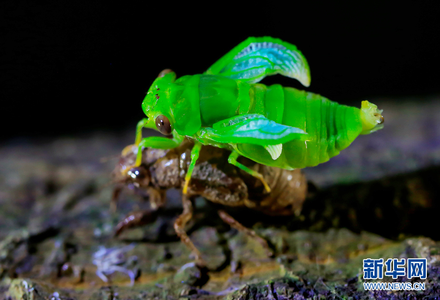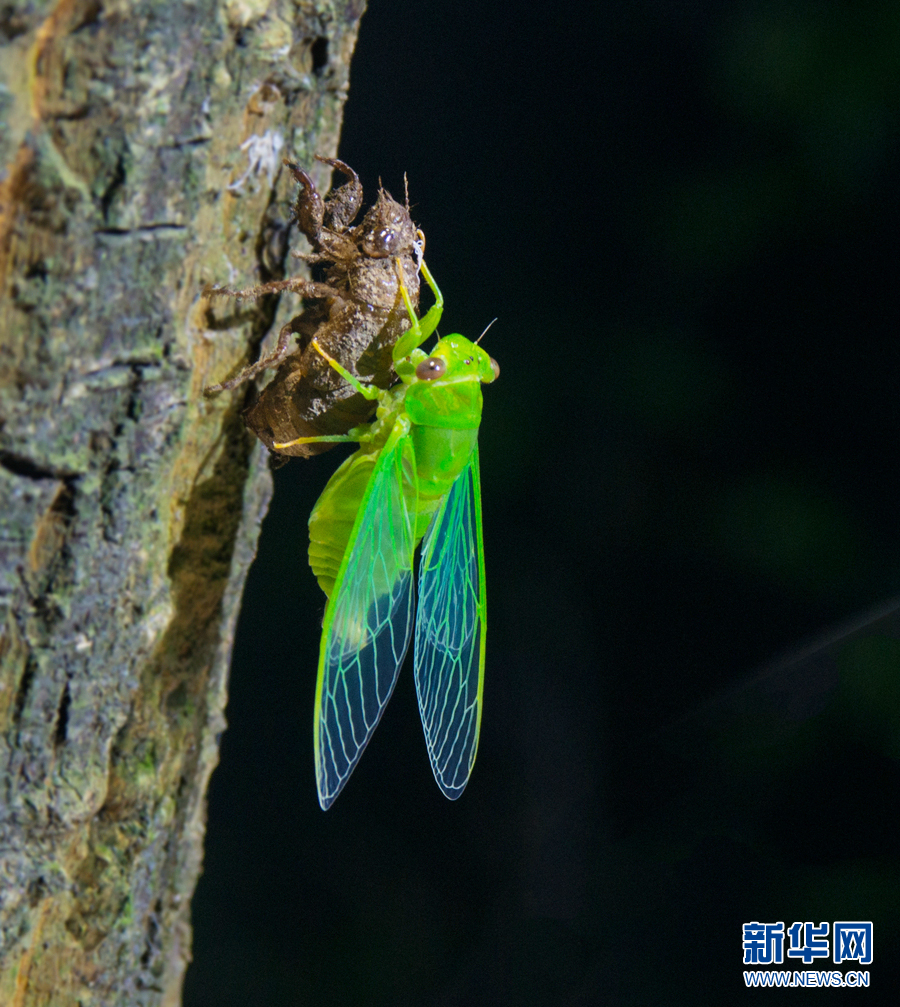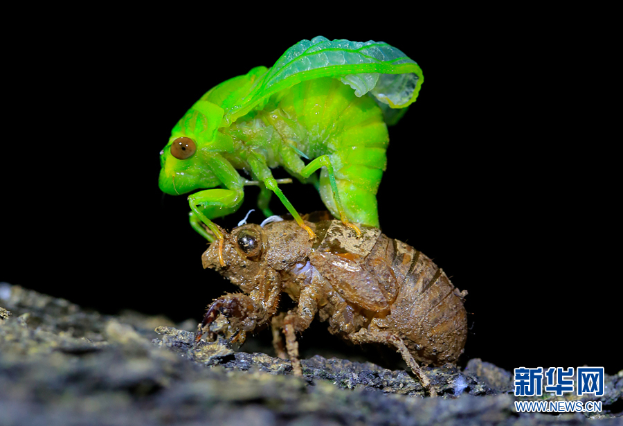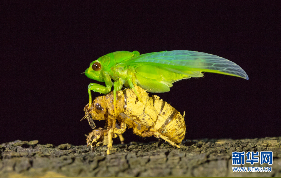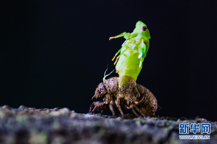 夏夜,在经过几个小时的蹲守后,广州几名摄影爱好者合作拍下一组照片来见证蝉脱壳的全过程。新华网发(佘建新摄)