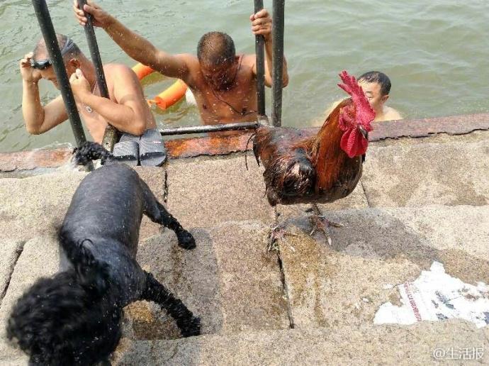 小公鸡上岸后立刻被众人给围上了,有的拍照有的录像,这只小公鸡立刻成了明星了。