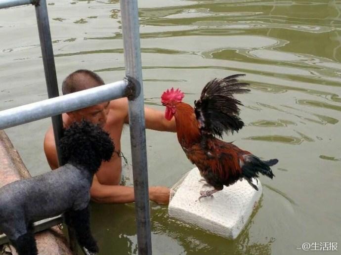这位老人伸手特别敏捷,一把手又将小鸡抓了回来,放在一个事先准备好的泡沫板上。然后老人一只手推着泡沫板的上公鸡,一边回头叫着小狗。在众人的呐喊声中,主人已经游进江中30多米远了。就在主人一转身向回游时,小公鸡再次跳入江中跟随主人向岸边游来。