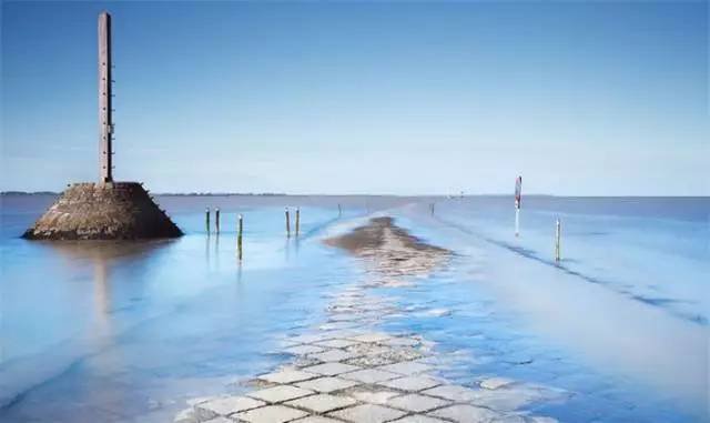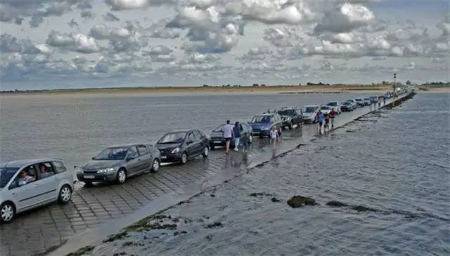 其实这是条会消失的公路,每当涨潮期间,这条公路会完全湮没在水下 4 米,每天只有两个时段可以通行。