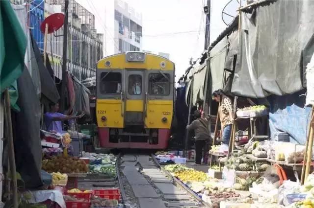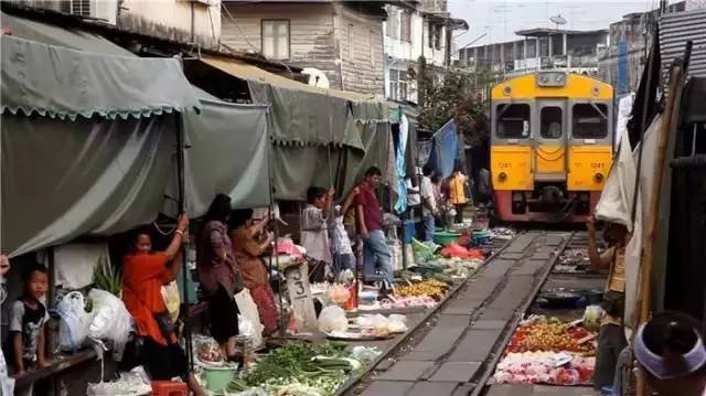 泰国 美功铁道市场:这个堪称世界上最危险的菜市场,因为每天都会有小火车经过,火车快到达时小贩们将货物搬到一旁。
