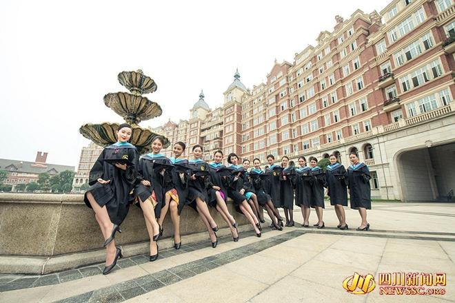 在该校校园中,十几名高挑靓丽的美女穿着各个航空公司的制服,摆出各种造型,庆祝毕业快乐。