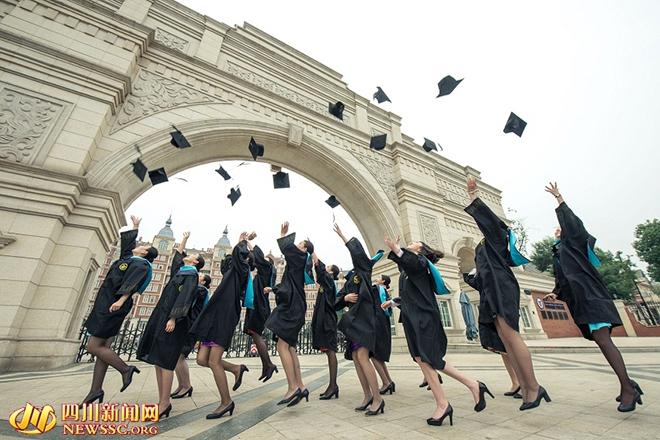 在该校校园中,十几名高挑靓丽的美女穿着各个航空公司的制服,摆出各种造型,庆祝毕业快乐。