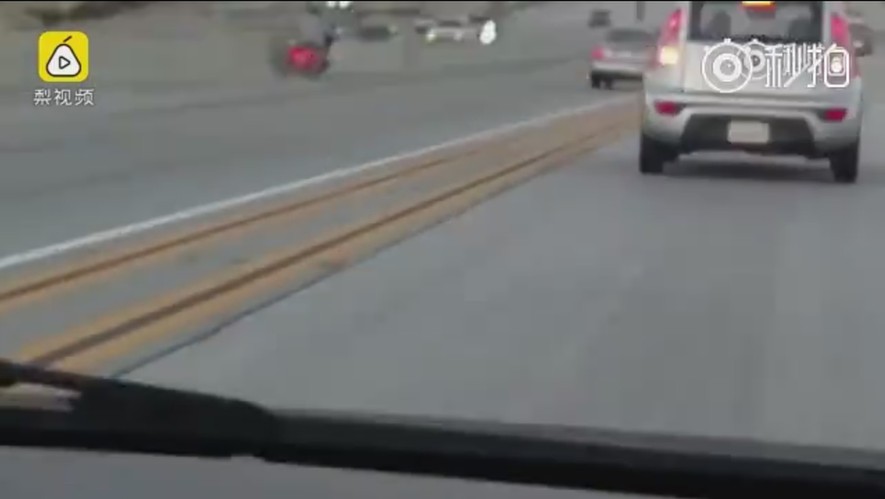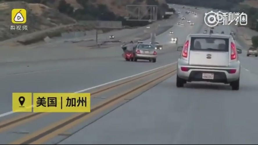 事发地点在美国加州,突然重机车骑士朝着旁边的轿车门猛的踹了一脚。