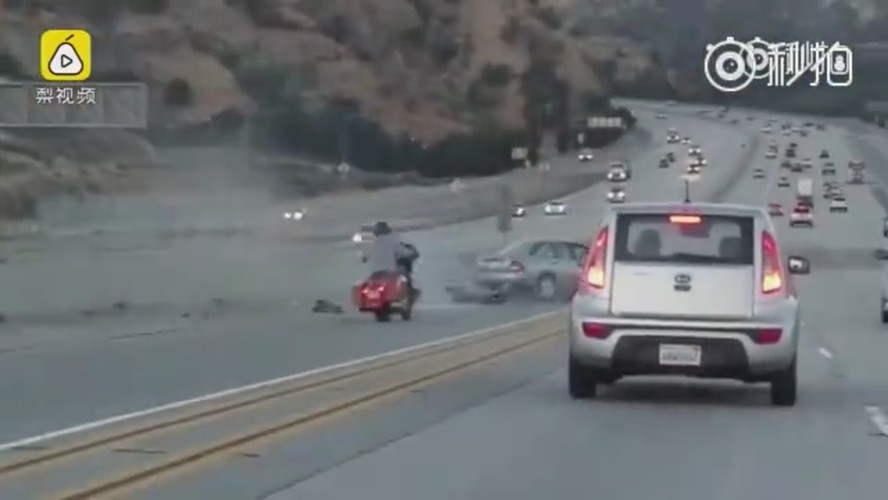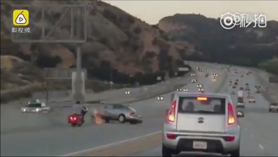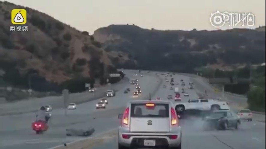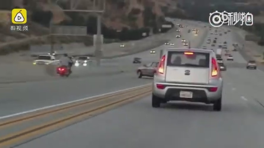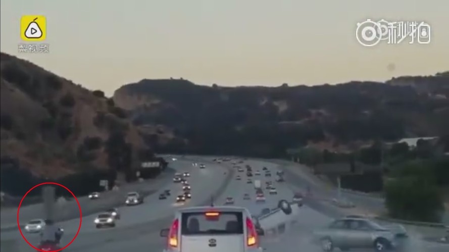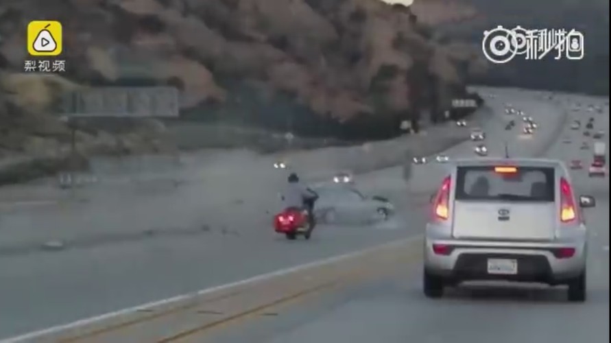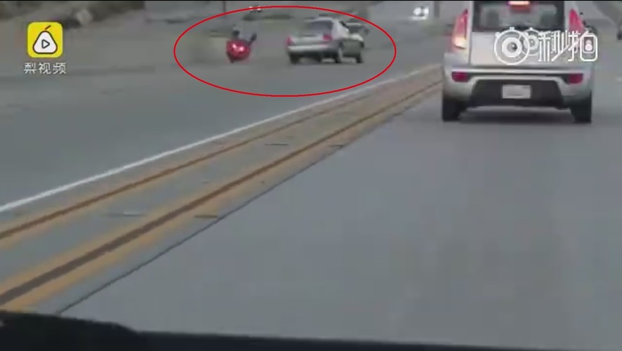 轿车司机努力的想控制好轿车的姿态,但无奈轿车的摆动越来越大,而此时摩托车骑士似乎也是有点懵,呆呆的看着轿车在试图撞自己之后竟然完全失控了。