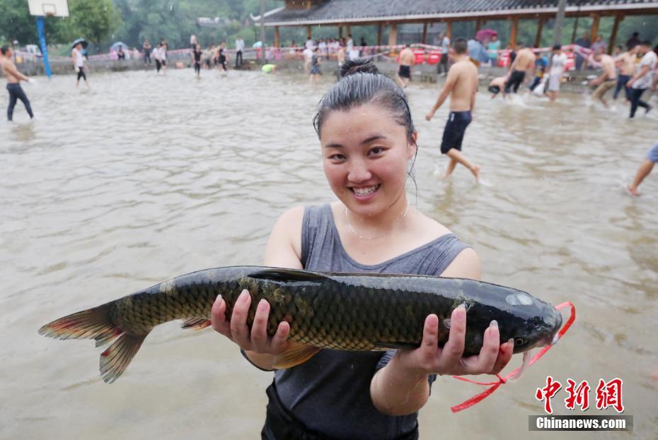 一名苗族姑娘展示抓到的草鱼。 谭凯兴 摄