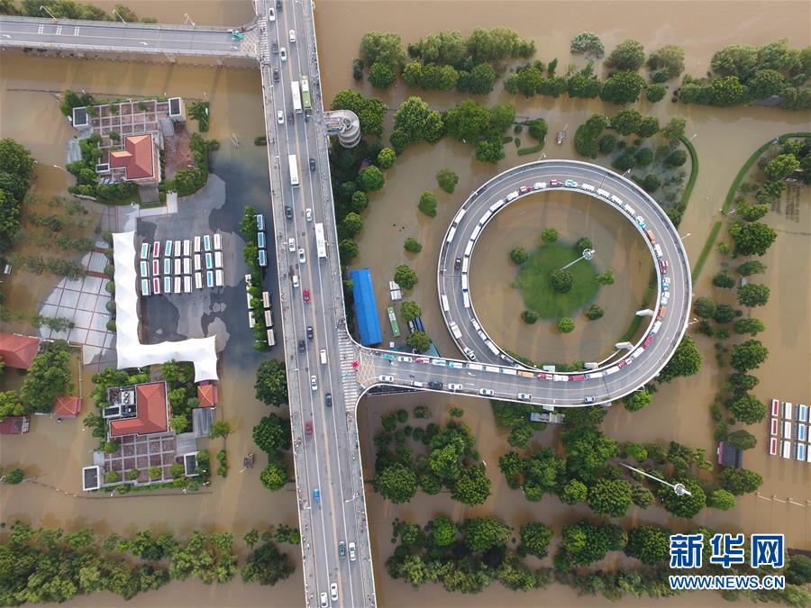 长沙橘子洲大桥从被洪水淹没的橘子洲景区上穿过(7月2日摄)。