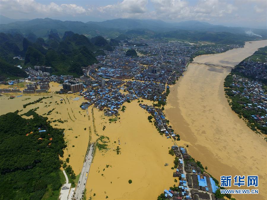 这是7月2日拍摄的广西融水苗族自治县县城。近日,受强降雨影响,广西柳州融水苗族自治县河流水位暴涨,部分地段积水严重,县城部分建筑被淹。新华社发(韦鼎标 摄)